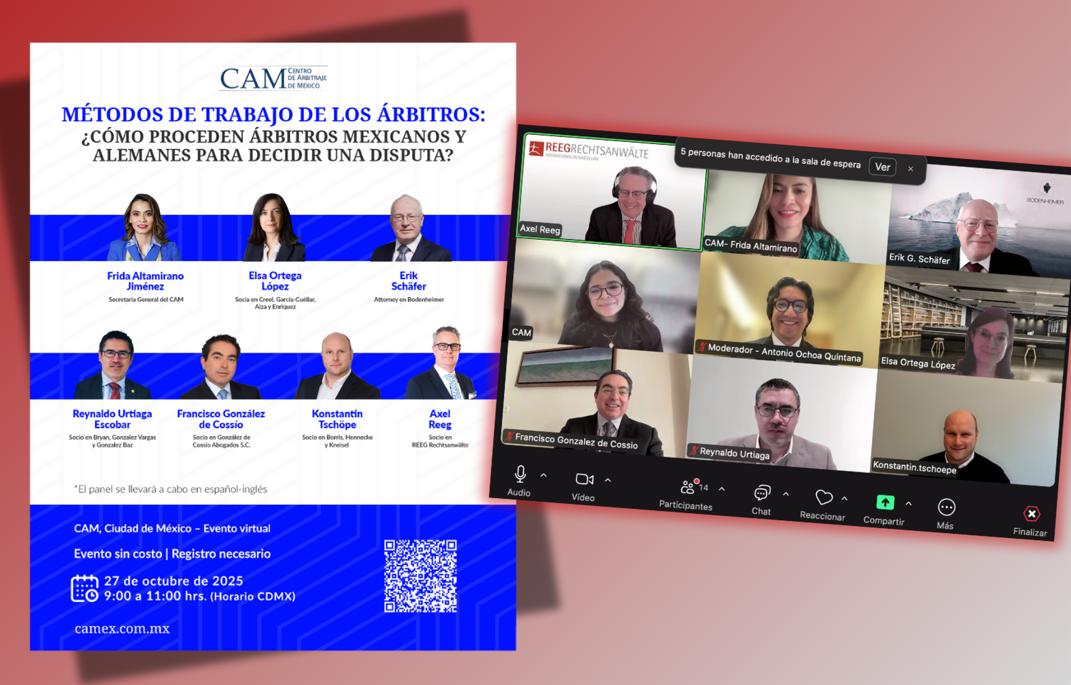 Am 27. Oktober 2025 fand die Online-Veranstaltung “Arbitrators’ Ways of Work – How Mexican and German Arbitrators Decide Their Cases” des Centro de Arbitraje de México (CAM) statt, an der Dr. Axel Reeg als Panel Speaker teilnahm. Das virtuelle Format brachte erfahrene Schiedsrichter aus Mexiko und Deutschland zusammen, um den Austausch über Erfahrungen und Methoden in der internationalen Schiedsgerichtsbarkeit zu fördern. Ziel war es, Einblicke in unterschiedliche Herangehensweisen bei der Fallbearbeitung und Entscheidungsfindung zu geben – von der Einleitung des Schiedsverfahrens bis zur Abfassung des Schiedsspruchs.