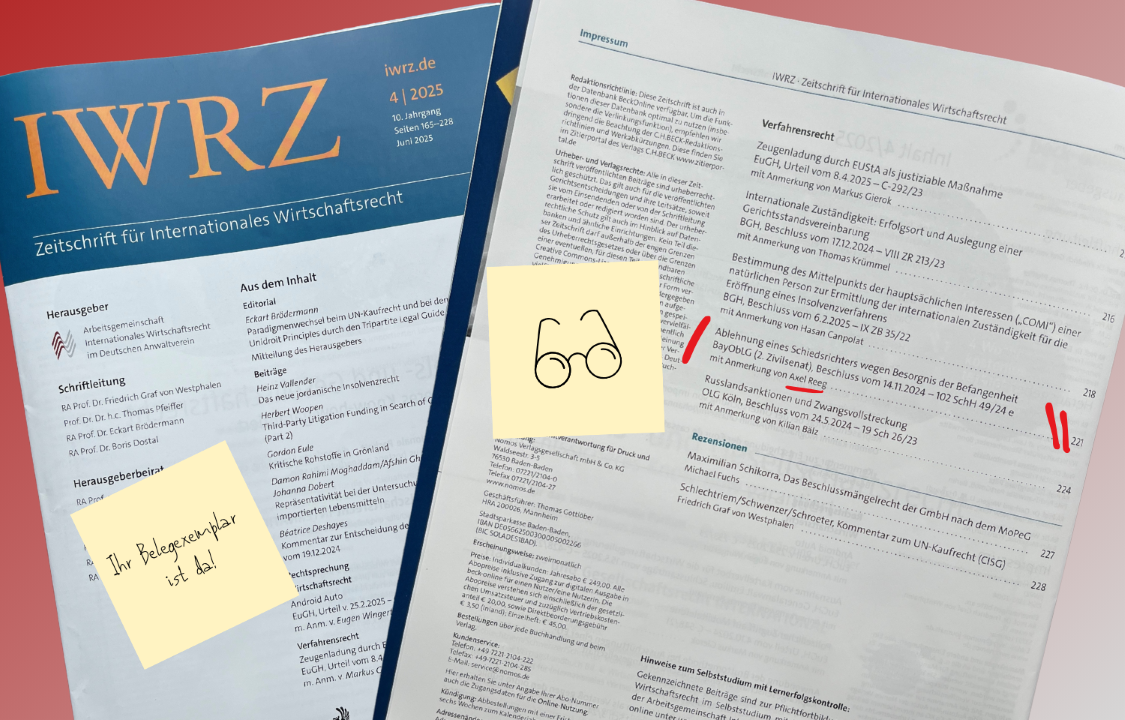 Im Juni 2025 wurde eine aktuelle Urteilsanmerkung von Dr. Axel Reeg in der renommierten Fachzeitschrift IWRZ – Zeitschrift für Internationales Wirtschaftsrecht veröffentlicht.